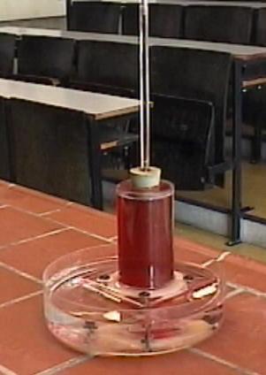 Wir beginnen gleich mit der Vorbereitung zu einem Versuch zur Osmose wie er rechts abgebildet ist. In der Abbildung erkennen wir eine Osmosekammer, die mit einer rötlichen Flüssigkeit gefüllt ist und in einer runden Glaswanne mit Wasser steht. Die Teile der Osmosekammer und ihren Zusammenbau kannst du dir hier anschauen. Für die Lösung in der Osmose-Kammer mischen wir in einem Becherglas