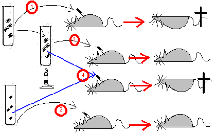 1 Griffith entnahm dem oberen Reagenzglas Kapsel bildende Bakterien und spritzte sie einer Maus ein. Die Maus bekam Lungenentzündung und starb im Verlauf dieser Krankheit.