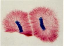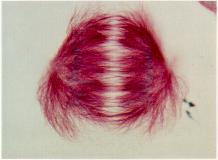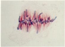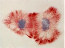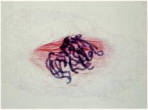![]() | Jedes Chromosom besteht aus zwei Tochterchromatiden, die nur durch das Centromer (Spindelfaseransatzstelle) zusammengehalten werden. | ![]() |