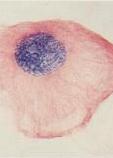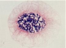 ![]() | Das Centriol hat sich verdoppelt und die beiden wandern zu den entgegengesetzten Seiten des Kerns. Zwischen ihnen entsteht die Kernteilungsspindel, der Spindelfaserapparat. Kernmembran und Kernkörperchen lösen sich auf. | ![]() |