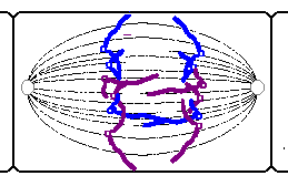![]() | Die Chromosomen sind an den jeweiligen Polen ) Die Kernspindel verschwindet. Die Kernhülle und das Kernkörperchen werden wieder ausgebildet. Zwischen den beiden neuen Zellen entstehen die Zellmembranen. | ![]() |