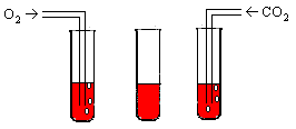Material: | 3 weite Reagenzgläser 2 Glaswinkelrohre passendes Schlauchmaterial Reagenzglasständer Sauerstoff-Flasche Kohlenstoffdioxid-Flasche Nicht-gerinnendes Blut (aus Versuch VBlut1a) |