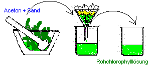 Material | ca. 3g Blätter (Brennessel, Spinat, Gras) Schere Reibschale Sand Aceton Filter Filterpapier Becherglas 50 ml |