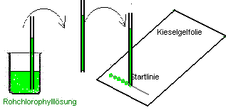 Etwa 10 bis 15 mm vom unteren Ende der Kieselgelfolie markiert man vorsichtig mit einem weichen Bleistift ganz zart die Startlinie (Sie muß höher sein als das Laufmittel in der Kammer.) . Auf dieser trägt man mit viel Geduld Punkt für Punkt die Farbstofflösung auf. Man hält hierzu die Kapillare in die Chlorophyllösung bis der Farbstoff angestiegen ist und tupft dann vorsichtig auf die Startlinie. Dabei wird die Lösung herausgesaugt. Damit man eine möglichst dünne Startlinie bekommt, darf man die entstehenden Punkte nicht zu groß werden lassen.