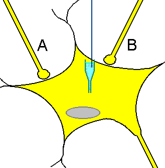 Zuerst wird Neurit A gereizt und dann mit Hilfe der Messanordnung die Erregung im Soma gemessen. In einem zweiten Durchgang wird Neurit B gereizt und das PSP gemessen. |