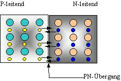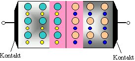 ![]() Wird nun eine Spannung angelegt (Minuspol am N-Halbleiter - Pluspol am P-Halbleiter), fließt ein elektrischer Strom durch die Elektronenbewegung vom N-Halbleiter zum P-Halbleiter (von der Elektronenüberschussseite zur Elektronenmangelseite). Bei umgekehrter Polung kann kein Strom fließen, weil im P-Halbleiter Elektronenmangel besteht. |