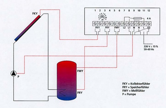 Der Regler ermittelt die Temperaturdifferenz zwischen Kollektorfühler (FKY)