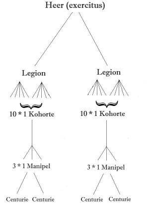 Sie gingen eine Weile auf der schnurgeraden Straße, und er erfuhr, daß Lucia, wie sie sich nannte, Tochter eines Legionärs dieser Legion war. Sie und ihre Mutter hatten sich - wie andere Zivilisten auch - aus der Lagervorstadt, auch Cannabae genannt, vor dem Germanenüberfall ins Lager gerettet, und niemand wußte, in welchem Zustand sie sich nach dem Überfall befinden würde. "Ein Heer, es heißt bei uns exercitus, besteht aus zwei Legionen. Hier in diesem Lager ist nur eine Legion stationiert. Jede Legion besteht aus 10 Kohorten, jede Kohorte umfaßt drei Manipel, und jeder Manipel besteht wiederum aus zwei Centurien."