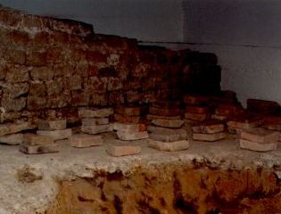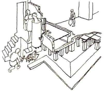 Usually they went to the baths for two hours: First they went into the trepidarium (warm bath for relaxation), then into the caldarium. The so-called hot, steamy bath was a basin filled with hot water in a steamy room. Finally they went to the frigidarium, which was outside. The baths were heated with an underground furnace, the walls were heated through tiles. Slaves continuously poked the fire, which was necessary to keep the heating going. Above the furnace water was heated in a boiler and went directly from there into the basins. Because the Romans frequently went to these baths, they needed water in vast amounts. | ![]() |